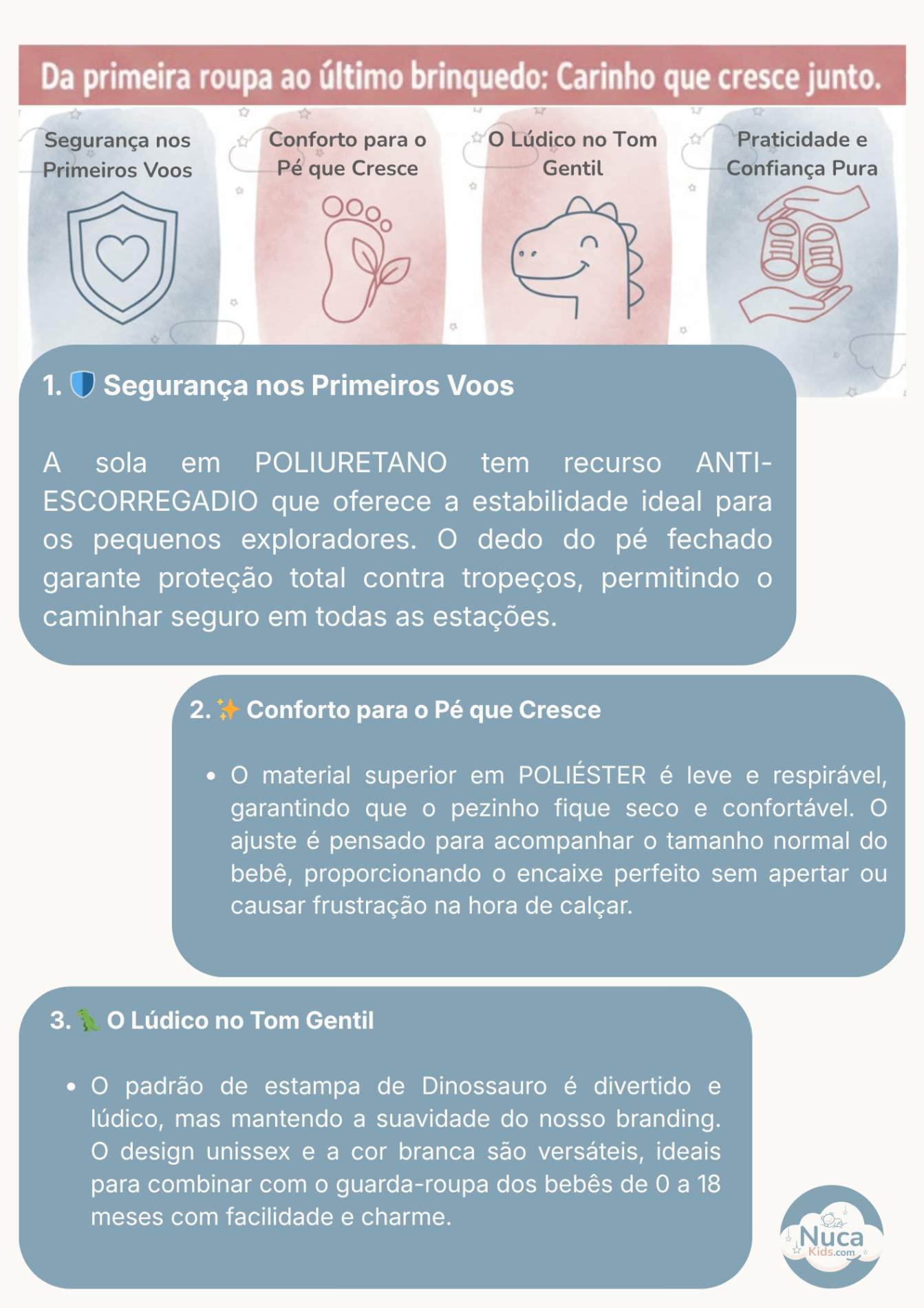 Este calçado da Nuca Kids foi pensado para ser a extensão do seu cuidado. Ele oferece a estabilidade para os primeiros voos e a suavidade dos materiais livres de toxinas, para que seu pequeno explorador possa descobrir o mundo com total confiança.